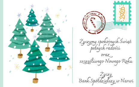 Życzymy spokojnych Świąt Bożego Narodzenia, pełnych radości oraz szczęśliwego Nowego Roku. Życzą Rada Nadzorcza, Zarząd i Pracownicy Banku Spółdzielczego w Narwi